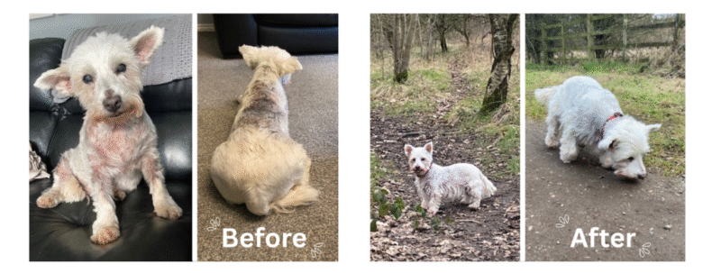 Bimble’s transformation is remarkable. Her skin is clear, her coat has grown back thick and vibrant, and her energy levels have greatly increased, allowing for longer walks and more play time! She is emotionally more confident, no ear infections in sight, and has clear eyes. Most significantly, she has successfully transitioned completely off her medication, remaining stable on her herbal formula for ongoing support, Bimble’s overall physical, mental and emotional wellbeing has significantly improved.